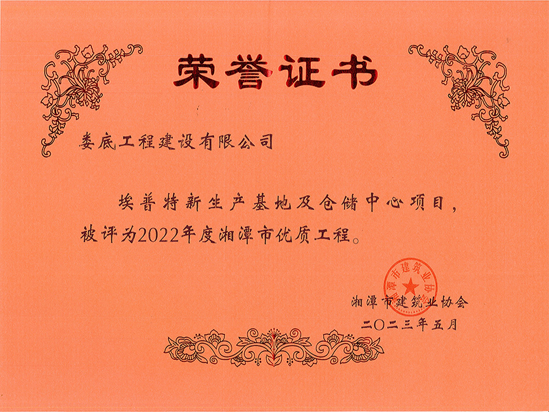 2022年度埃普特新生產(chǎn)基地及倉(cāng)儲(chǔ)中心項(xiàng)目湘潭市優(yōu)質(zhì)工程榮譽(yù)證書